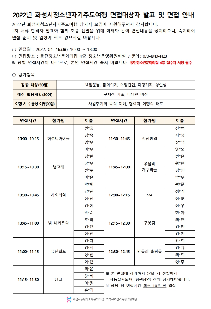 제목 2022년 화성시청소년자기주도여행 1차 서류전형 합격자 안내 작성일 2022년 4월 13일 16시 37분 조회수 448 첨부 파일 아이콘자주여_1차.jpg (428.95KB)다운로드 아이콘 목록보기