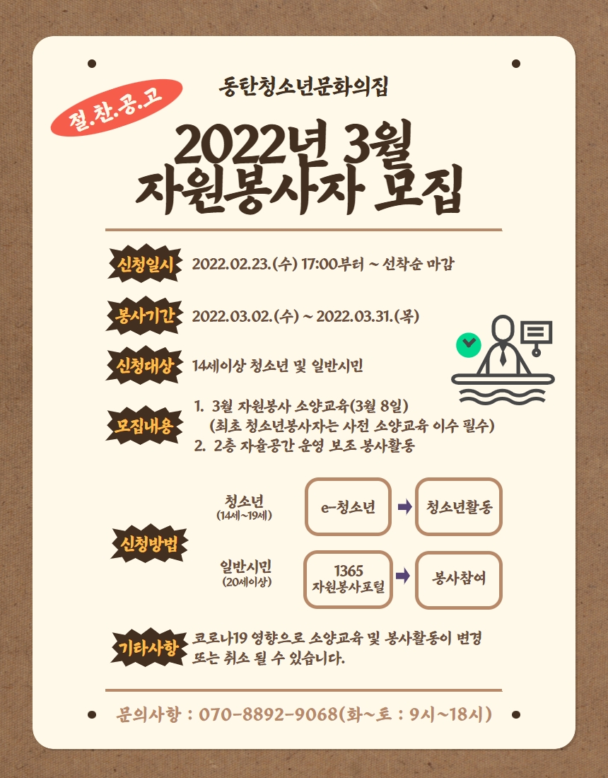 제목 2022년 3월 자원봉사자 모집 작성일 2022년 2월 23일 10시 36분 조회수 409 첨부 파일 아이콘3월 자원봉사자 모집.jpg (426.91KB)다운로드 아이콘 목록보기
