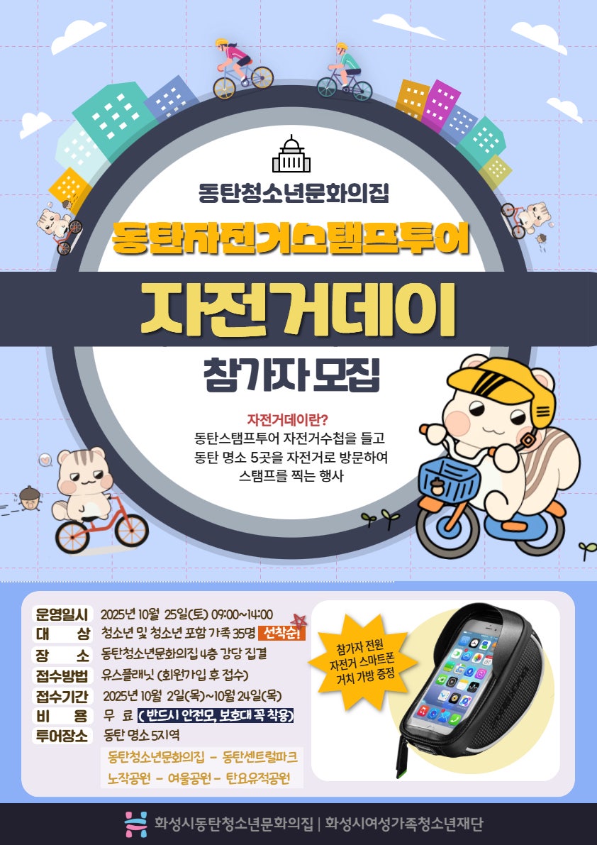 | 제목 | 공지 [동탄청소년문화의집] 동탄자전거스탬프투어 자전거데이 참가자 모집 | ||