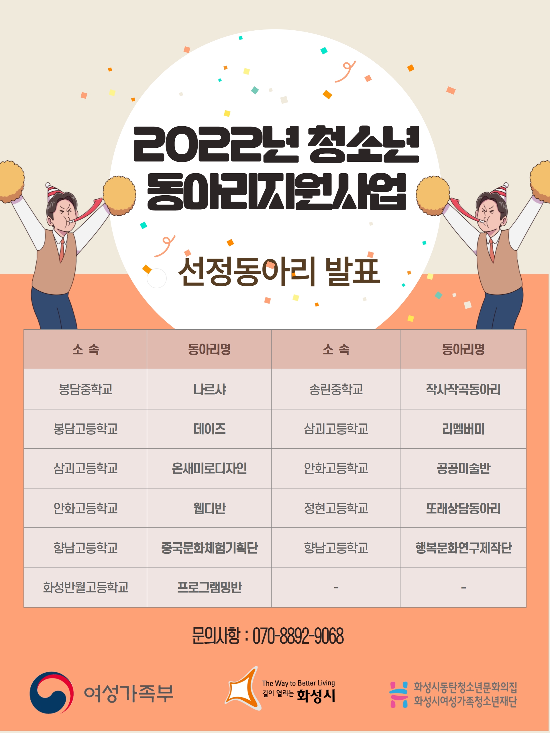 2022년 화성시청소년동아리지원사업의 선정동아리를 공지하며, 사업관련 설명회를 개최하오니 동아리대표자와 담당지도자의 필수 참석을 요청드립니다. 가. 일 시 : 2022. 04. 22.(금) 17:00 나. 장 소 : 동탄청소년문화의집 4층 강당 다. 대 상 : 선정 동아리대표자 및 담당지도사 라. 내 용 : 동아리 소개, 보조금 사용방법, 활동보고서 및 정산보고서 제출 요령 등 마. 문의전화 : 동탄청소년문화의집 070-8892-9068 바. 비 고 : 동아리대표자 외 동아리회원 중 1명 참석 가능