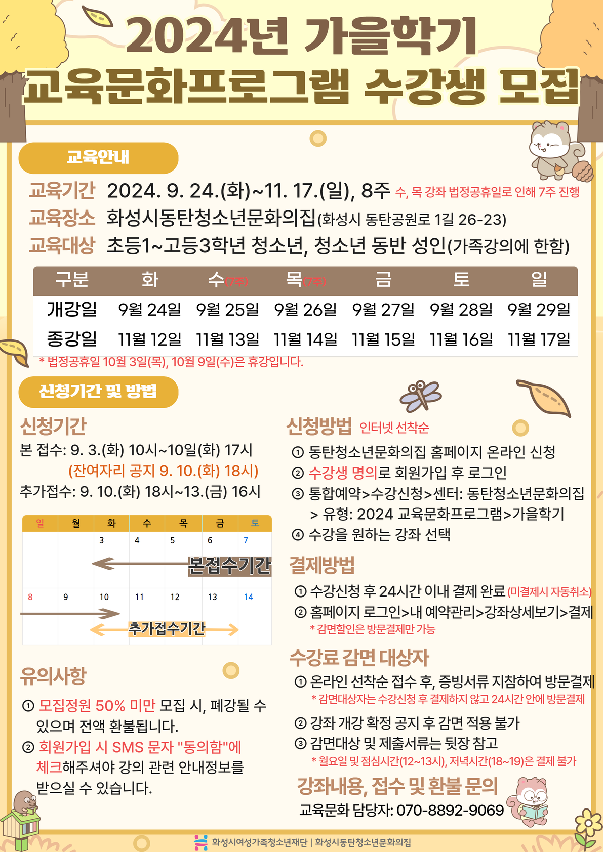 - 문의사항: 070-8892-9069(월요일 및 점심시간(12~13시), 저녁시간(18~19시) 연락 불가)