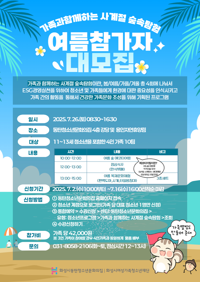 안녕하세요, 동탄청소년문화의집입니다! 자연 속에서 가족과 함께 특별한 여름의 추억을 만들기 위해 이번 여름편은 초록이 가득한 용인자연휴양림에서 진행되며, 가족이 함께 미션을 수행하며 즐기는 ‘에코티어링’ 활동, 이번 숲속탐험은 단순한 체험을 넘어 자세한 사항은 하단의 포스터 및 홈페이지 및 접수 바로가기 ☎ 문의: 031-8058-2106 (동탄청소년문화의집) |