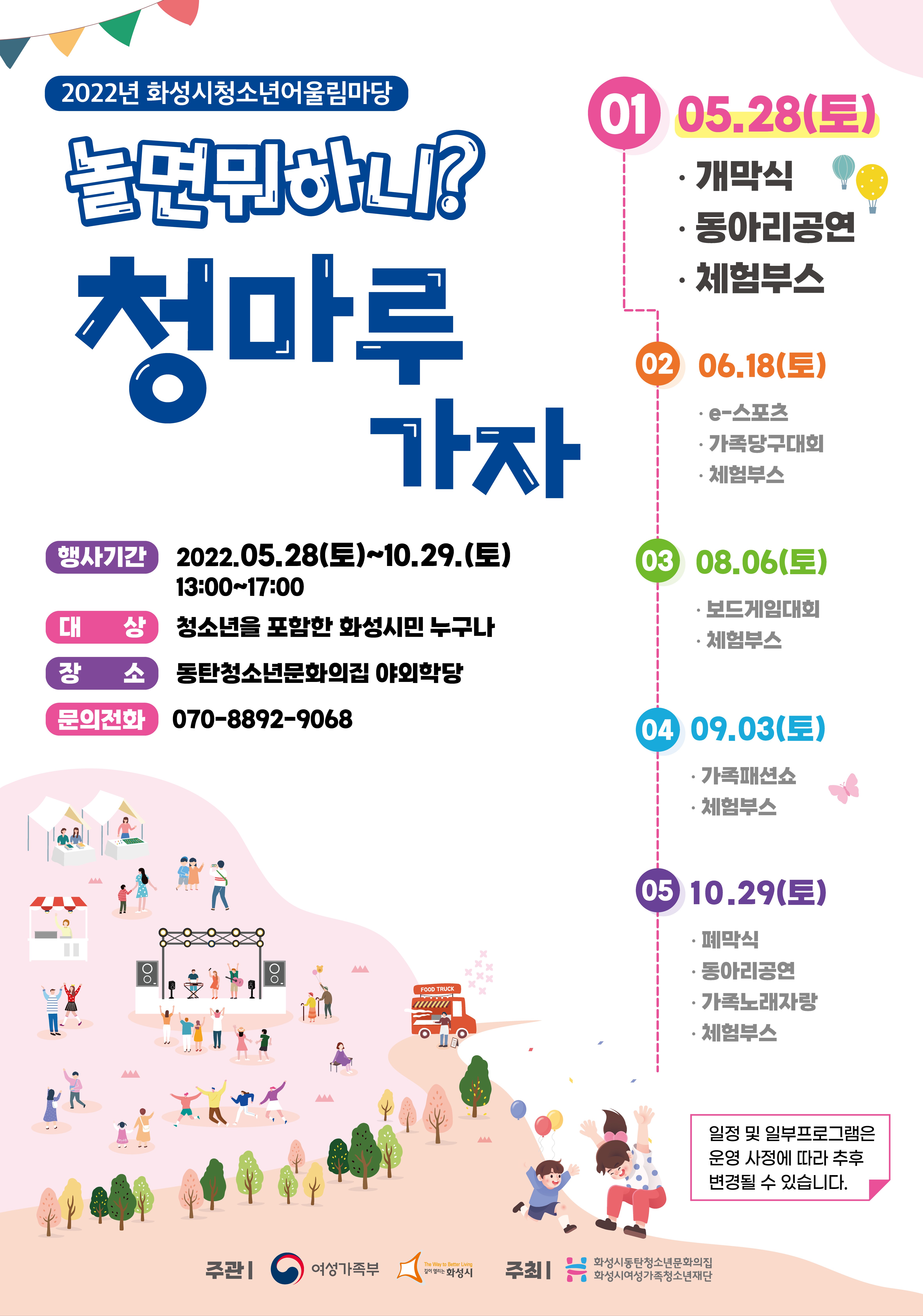 제목 2022년 화성시청소년어울림마당 일정안내 작성일 2022년 5월 12일 11시 7분 조회수 477 첨부 파일 아이콘001001401_202205131934070009.jpg (1.77MB)다운로드 아이콘 ? 목록보기