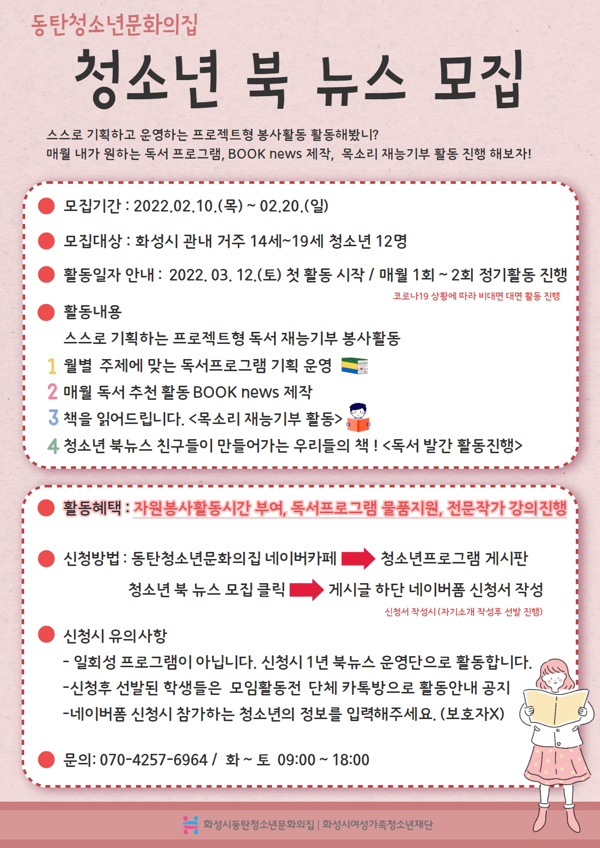 제목 2022년 청소년 북 뉴스 운영단 모집 작성일 2022년 2월 10일 15시 56분 조회수 348 첨부 파일 아이콘제목을 입력하세요 (51).jpg (990.03KB)다운로드 아이콘 ? 목록보기