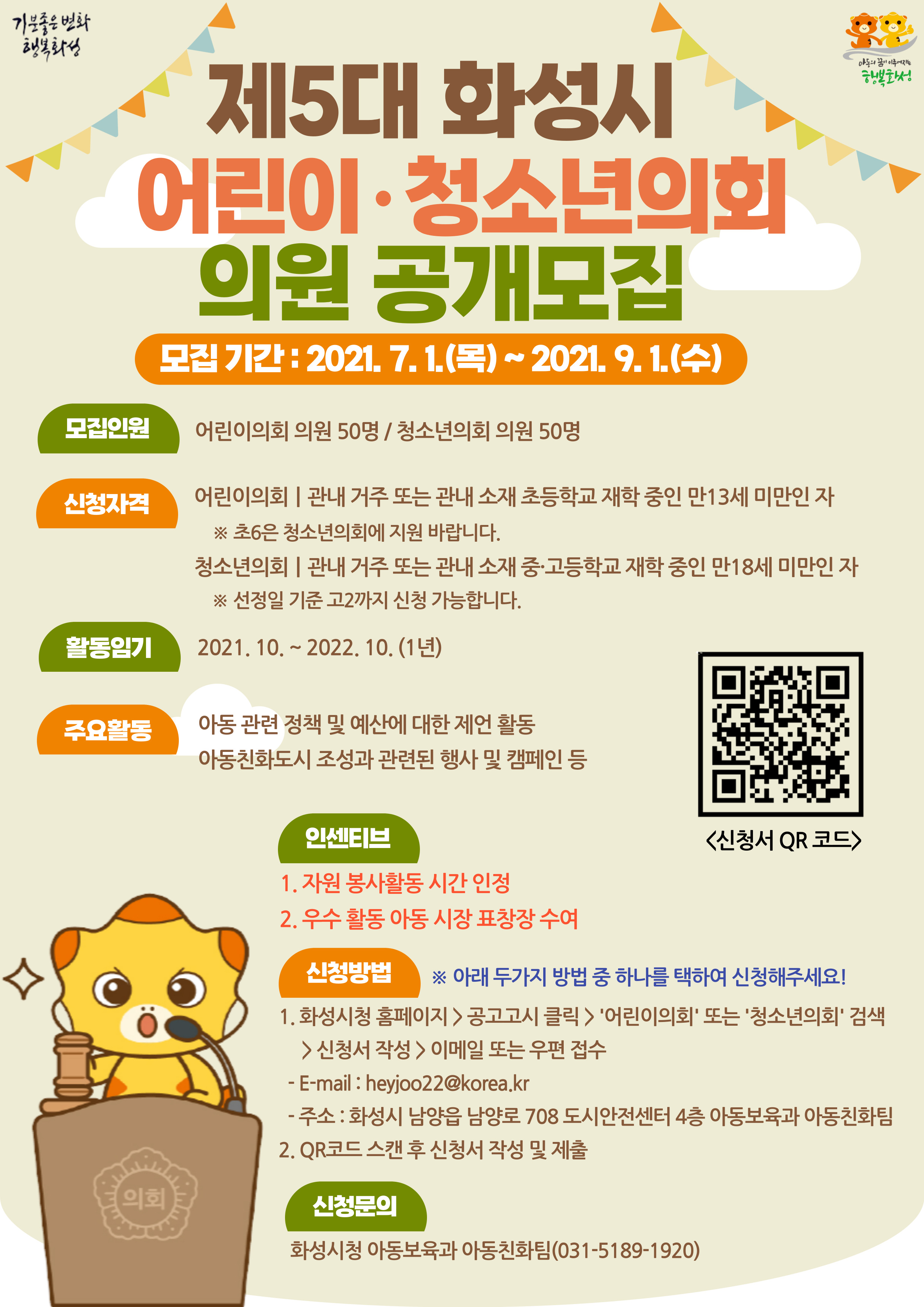 제목 [화성시] 제5대 화성시 어린이 의회 및 청소년의회 의원 모집 작성일 2021년 8월 18일 10시 44분 조회수 391 첨부 파일 아이콘홍보포스터.jpg (1.05MB)다운로드 아이콘 목록보기