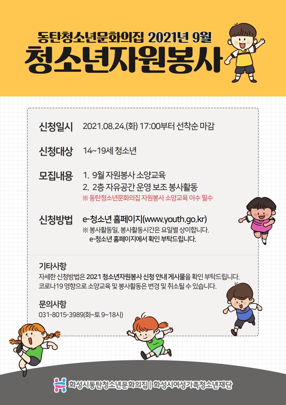 제목 2021년 9월 청소년자원봉사 모집 안내 작성일 2021년 8월 21일 14시 33분 조회수 418 첨부 파일 아이콘제목을 입력하세요 (19).jpg (647.58KB)다운로드 아이콘 목록보기