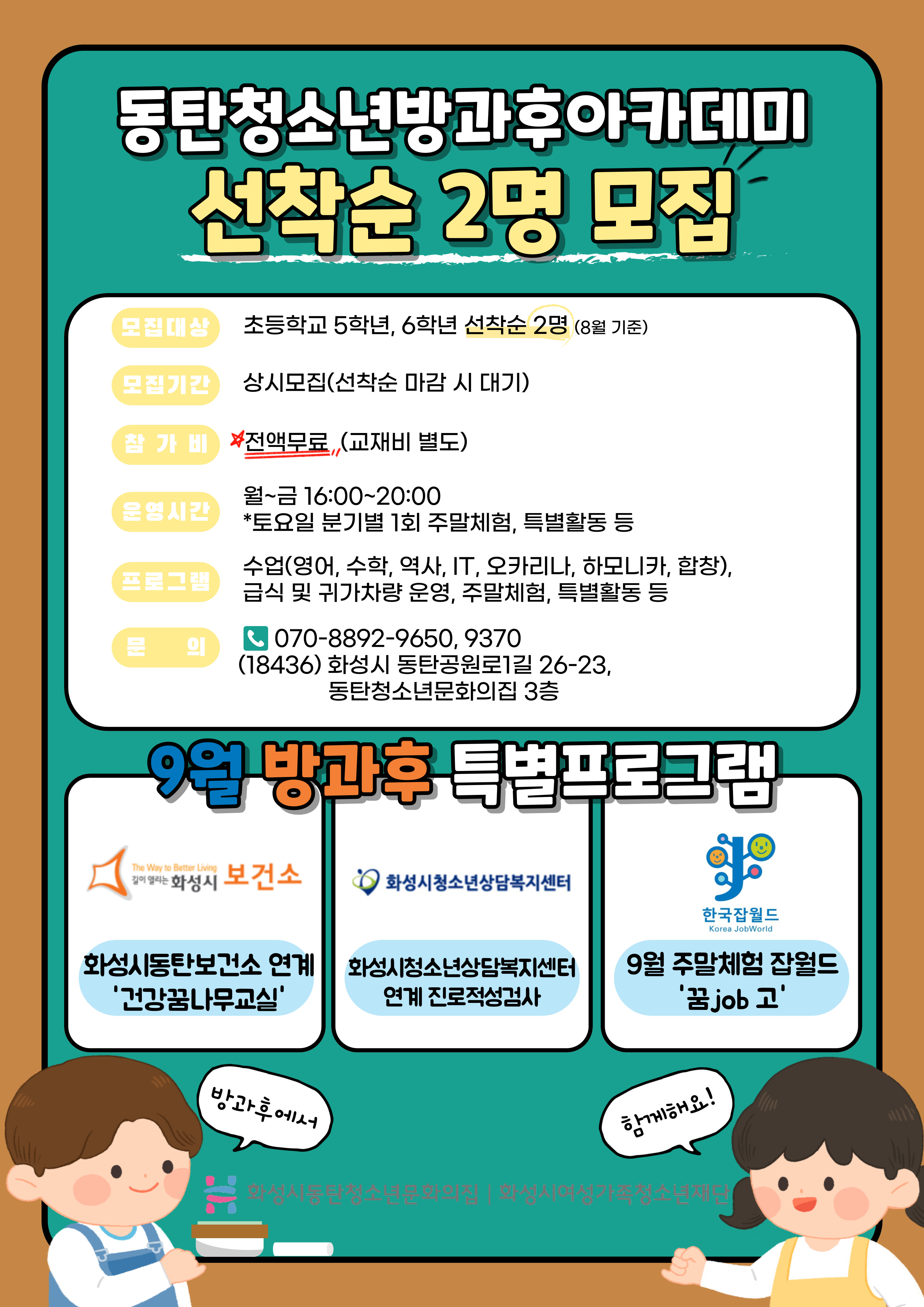 선착순 2명만 모집 하오니, 화성시 관내에 거주하고 있는 초등학교 5, 6학년이라면 방과후아카데미와 함께해요!