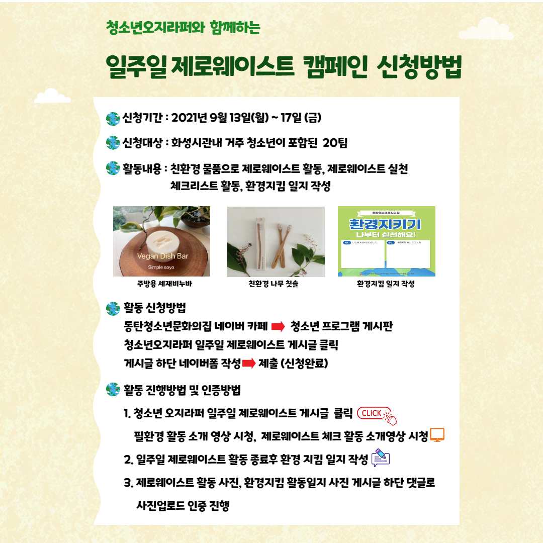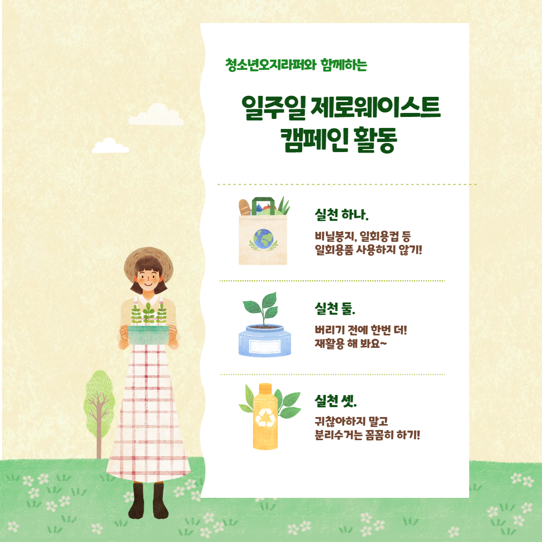 | 제목 | 청소년오지라퍼와 함께하는 제로웨이스트 캠페인 신청 | ||