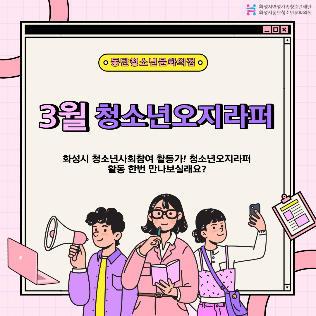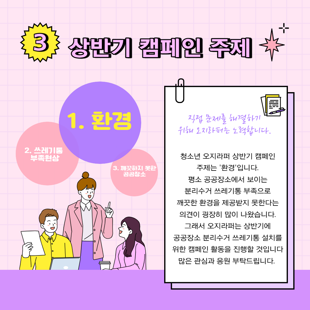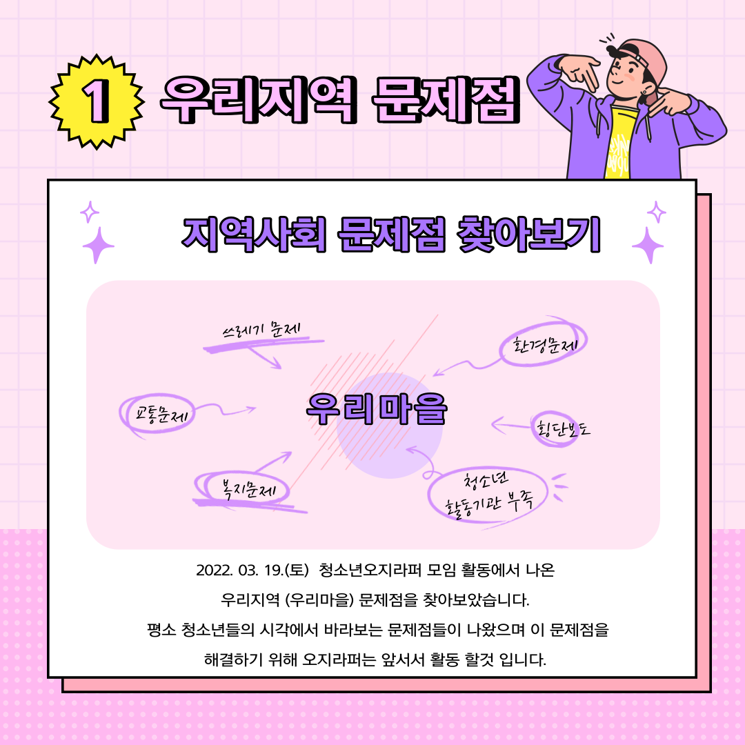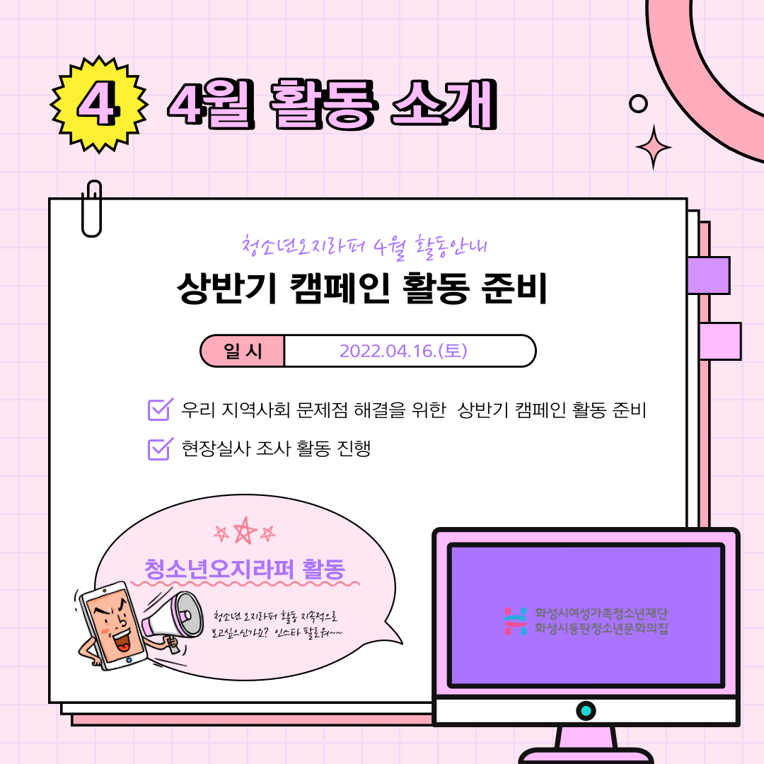 활동일시: 2022. 03.19.(토) 13:00~16:00 활동내용: 청소년오지라퍼 OT 진행 및 상반기 캠페인 활동 주제선정 ? |
