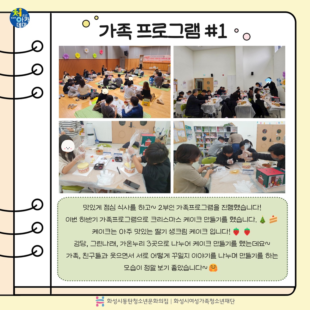 안녕하세요~ 동탄청소년방과후아카데미입니다:) 지난 11월 30일 토요일 동탄청소년문화의집에서 청소년방과후아카데미 하반기 학부모 간담회 및 가족프로그램을 진행했습니다~ 2025년에도 진행할 예정이오니, 많은 관심과 참여 부탁드립니다~ 감사합니다! |