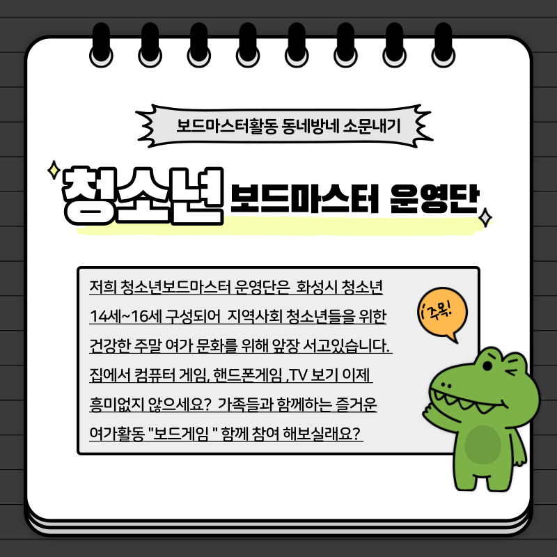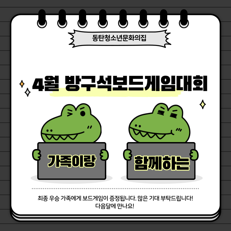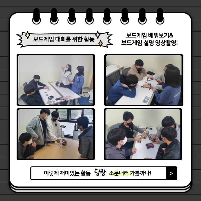 활동일자 : 2022. 03.26.(토) 10:00~15:00 활동내용: 보드게임 이란? 보드게임 OT, 전문강사님과 함께하는 보드게임 배워보기, 보드게임 영상제작 활동진행 |