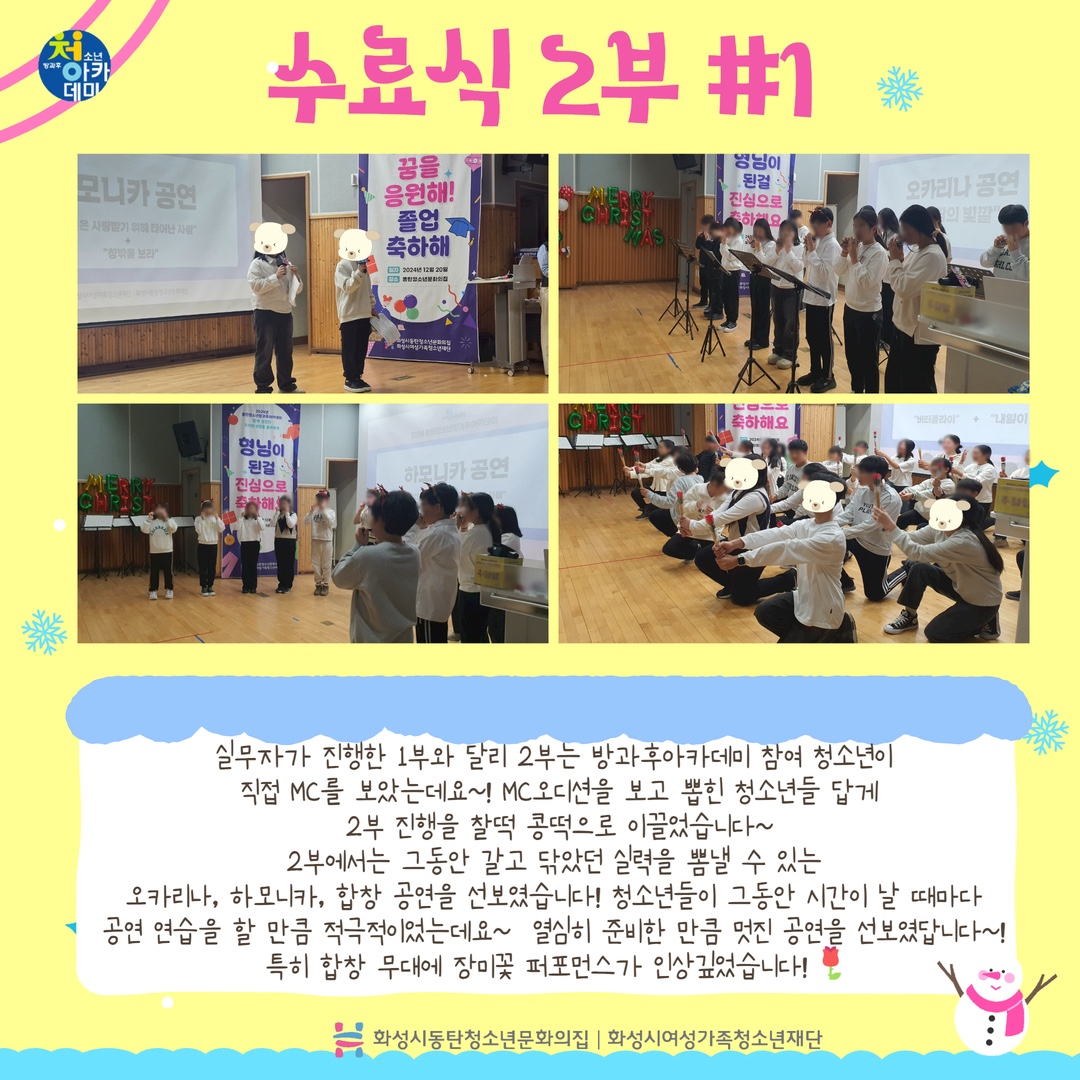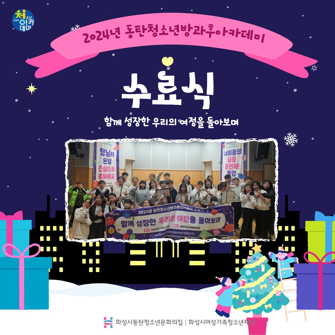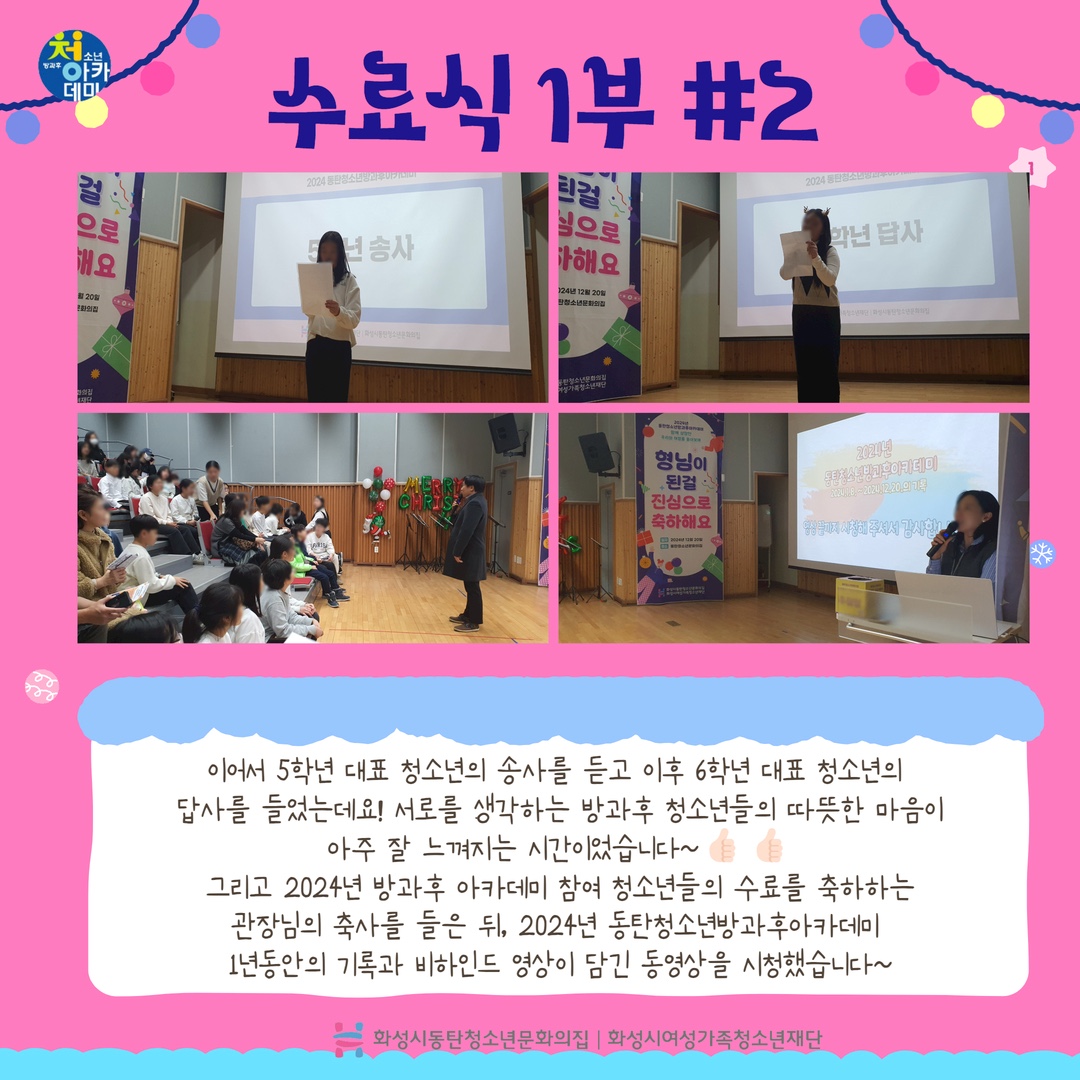 안녕하세요~ 동탄청소년방과후아카데미입니다! 지난 20일 금요일 동탄청소년문화의집에서 4층 강당에서 청소년방과후아카데미 수료식을 진행했습니다~ 2024년 방과후아카데미 한해 동안의 기록을 살펴보고 청소년들이 그동안 준비했던 실력을 뽐내는 공연도 선보였습니다. 2025년에도 방과후아카데미 신규 청소년을 모집하고 있으니, 많은 관심과 참여 부탁드립니다! ※ 신규 청소년 모집 문의는 기관 전화로 문의주세요! 2025년에도 동탄청소년방과후아카데미와 함께 해요! 즐겁고 따뜻한 연말 보내시기 바랍니다. 감사합니다! |