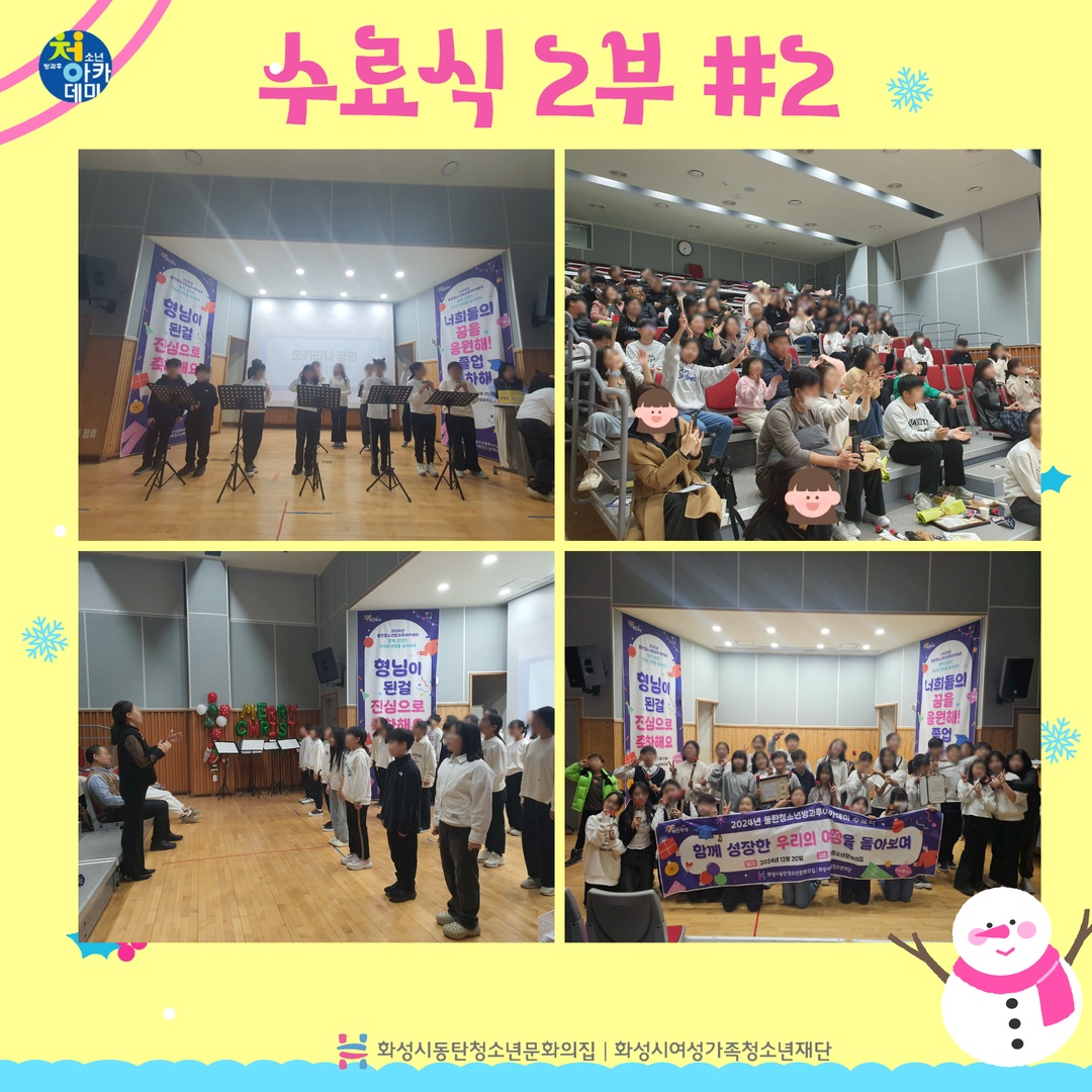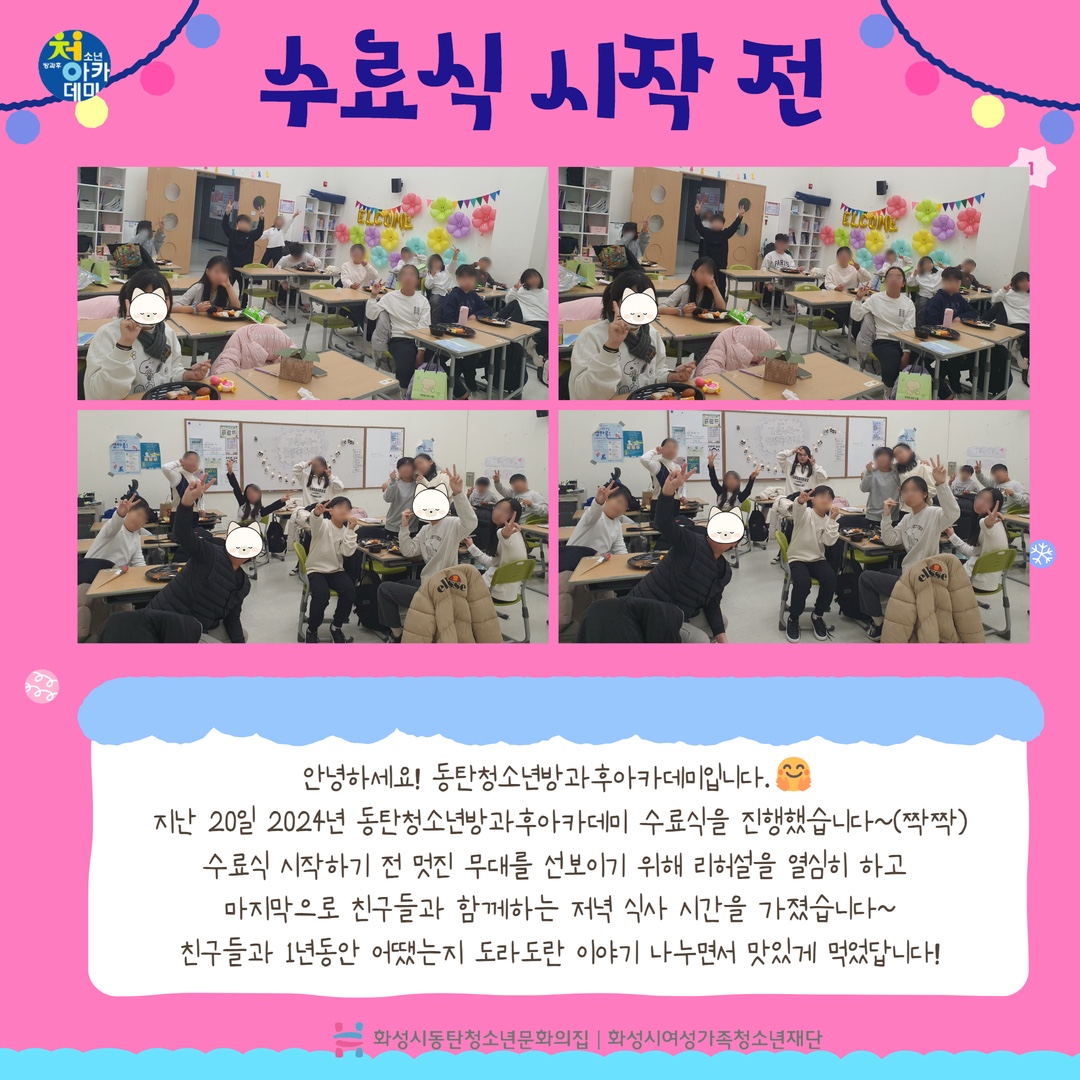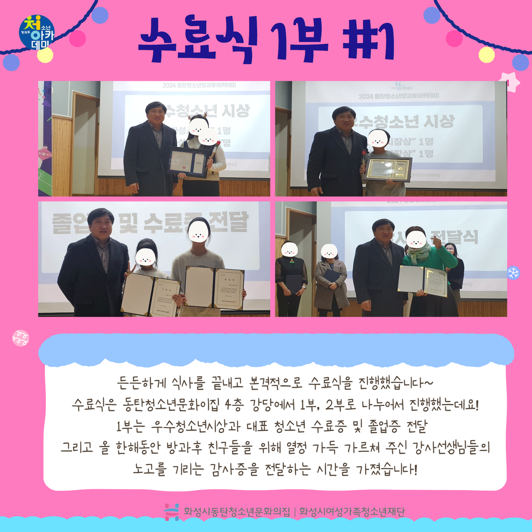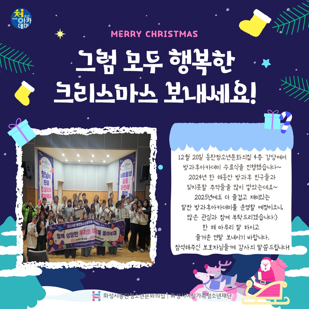 안녕하세요~ 동탄청소년방과후아카데미입니다! 지난 20일 금요일 동탄청소년문화의집에서 4층 강당에서 청소년방과후아카데미 수료식을 진행했습니다~ 2024년 방과후아카데미 한해 동안의 기록을 살펴보고 청소년들이 그동안 준비했던 실력을 뽐내는 공연도 선보였습니다. 2025년에도 방과후아카데미 신규 청소년을 모집하고 있으니, 많은 관심과 참여 부탁드립니다! ※ 신규 청소년 모집 문의는 기관 전화로 문의주세요! 2025년에도 동탄청소년방과후아카데미와 함께 해요! 즐겁고 따뜻한 연말 보내시기 바랍니다. 감사합니다! |