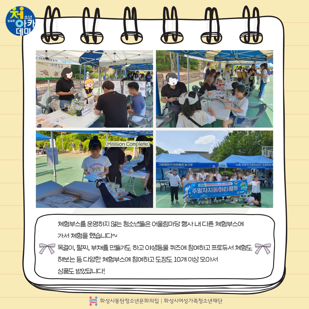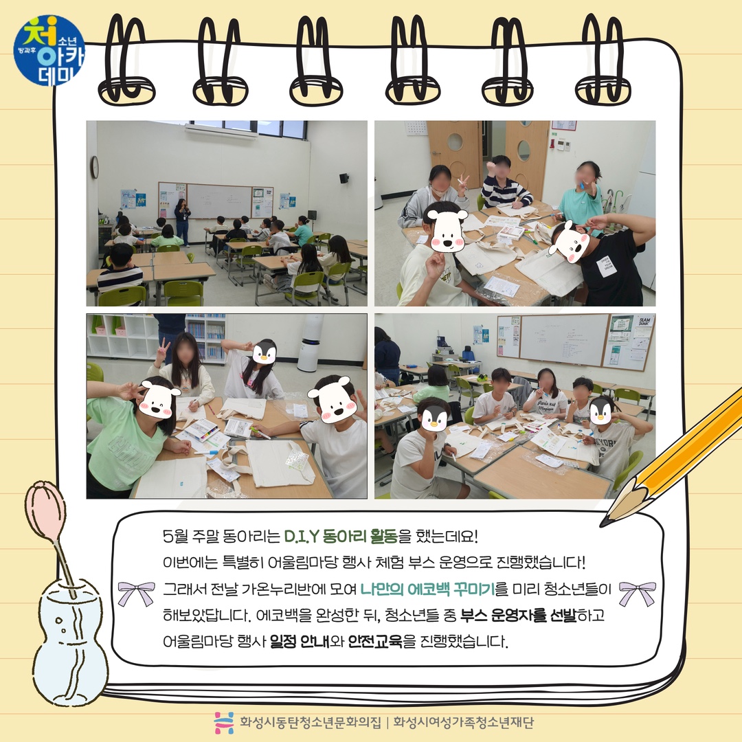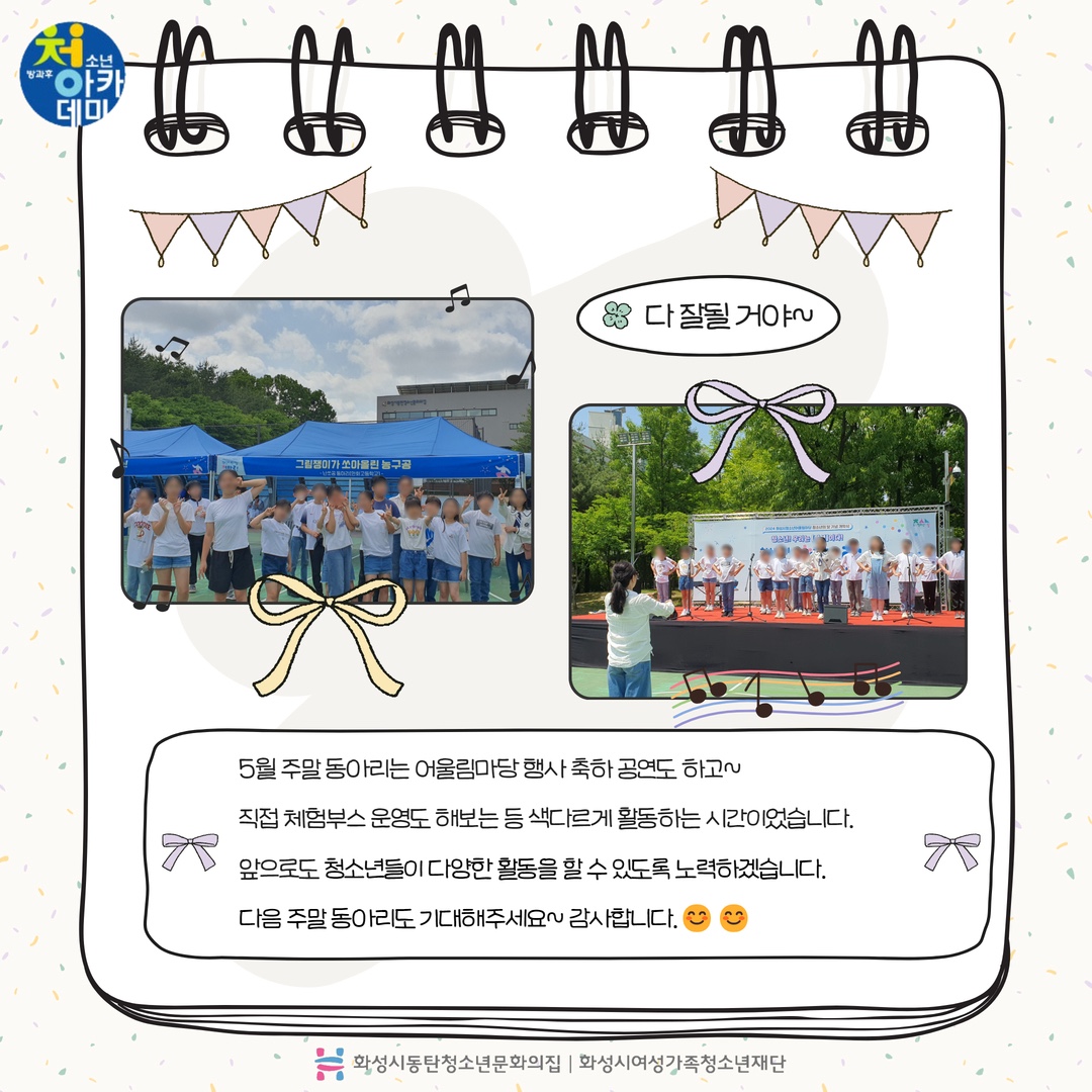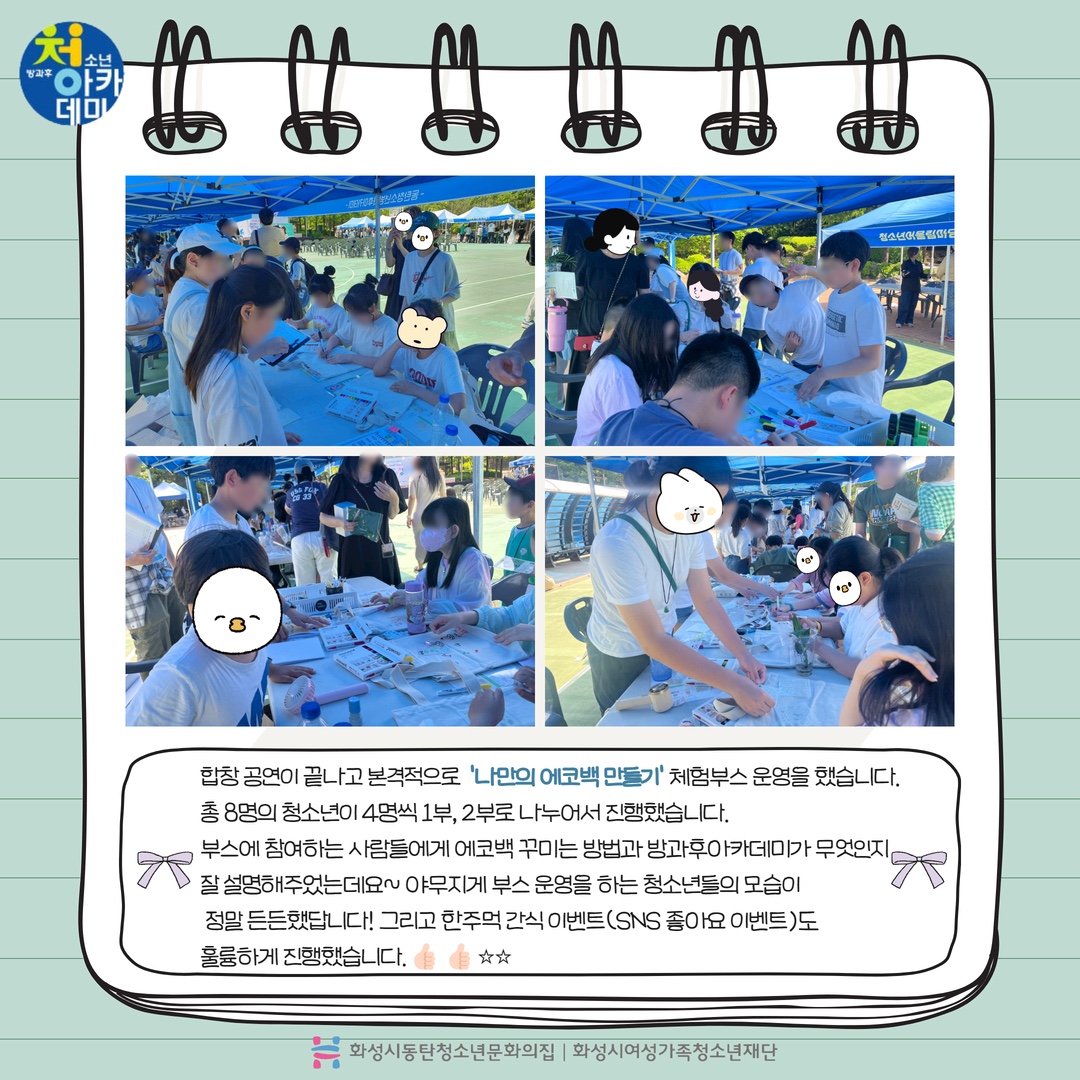 동탄청소년방과후아카데미 2024년 5월 주말 동아리_D.I.Y(어울림마당) 재단에 바랍니다 상세 운영센터 동탄청소년문화의집 등록일 2024년 5월 28일 14시 55분 조회수 246 안녕하세요! 동탄청소년문화의집 청소년방과후아카데미입니다.5월 18일 토요일 동탄센트럴파크 농구장에서 5월 주말동아리를 진행했습니다~이번 주말 동아리는 어울림 마당 축하 공연(합창)과 청소년들이 직접 체험부스(나만의 에코백 만들기)를 운영했습니다. 다음 주말 동아리도 기대해주세요~ 감사합니다! *_* ? 파일 아이콘1.jpg (323.64KB)다운로드 아이콘 파일 아이콘2.jpg (397.62KB)다운로드 아이콘 파일 아이콘3.jpg (372.16KB)다운로드 아이콘 파일 아이콘4.jpg (472.95KB)다운로드 아이콘 파일 아이콘5.jpg (357.1KB)다운로드 아이콘 파일 아이콘6.jpg (413.04KB)다운로드 아이콘 파일 아이콘7.jpg (444.1KB)다운로드 아이콘 파일 아이콘8.jpg (467.37KB)다운로드 아이콘 파일 아이콘9.jpg (427.06KB)다운로드 아이콘 파일 아이콘10.jpg (344.54KB)다운로드 아이콘 목록보기
