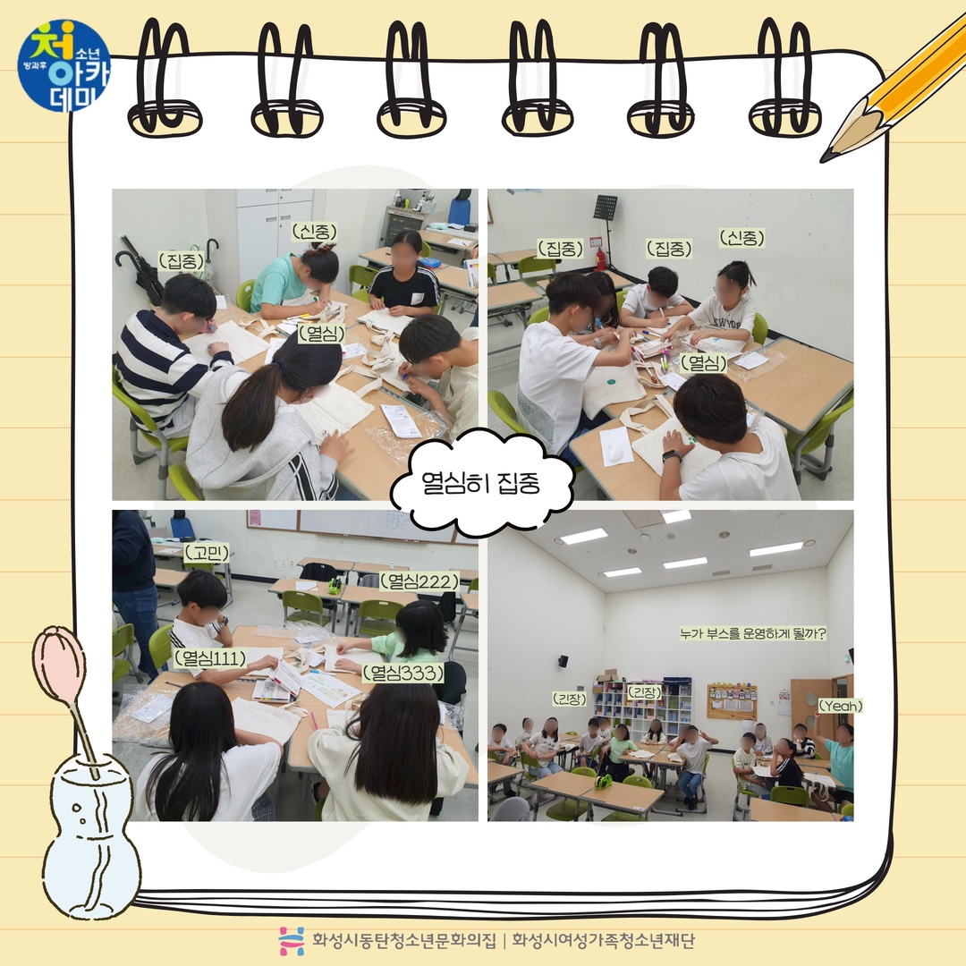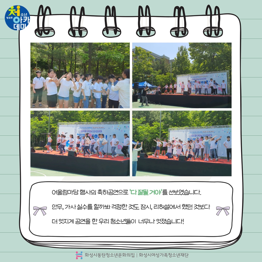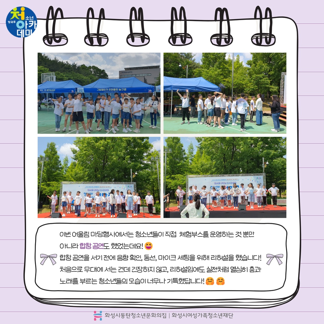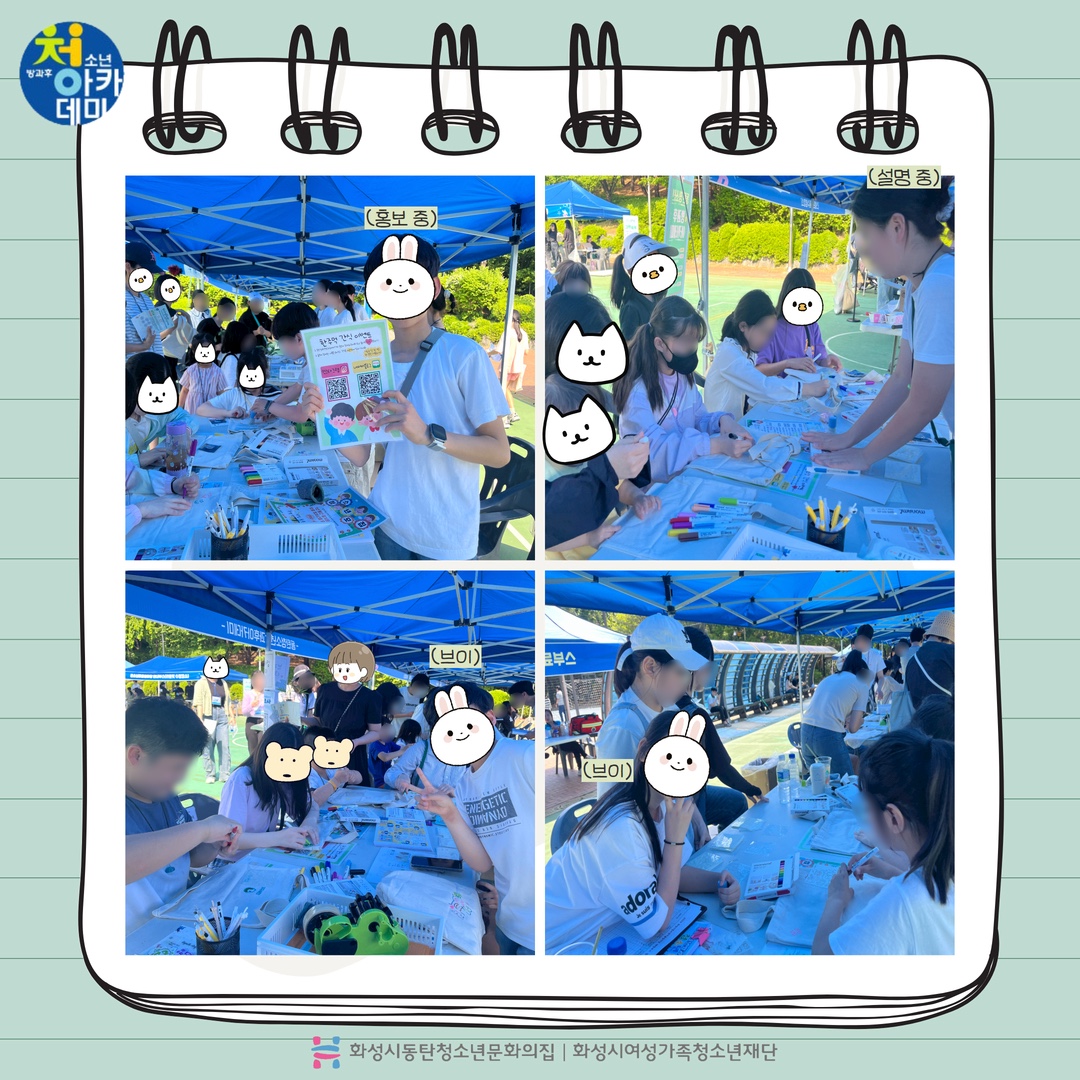 동탄청소년방과후아카데미 2024년 5월 주말 동아리_D.I.Y(어울림마당) 재단에 바랍니다 상세 운영센터 동탄청소년문화의집 등록일 2024년 5월 28일 14시 55분 조회수 246 안녕하세요! 동탄청소년문화의집 청소년방과후아카데미입니다.5월 18일 토요일 동탄센트럴파크 농구장에서 5월 주말동아리를 진행했습니다~이번 주말 동아리는 어울림 마당 축하 공연(합창)과 청소년들이 직접 체험부스(나만의 에코백 만들기)를 운영했습니다. 다음 주말 동아리도 기대해주세요~ 감사합니다! *_* ? 파일 아이콘1.jpg (323.64KB)다운로드 아이콘 파일 아이콘2.jpg (397.62KB)다운로드 아이콘 파일 아이콘3.jpg (372.16KB)다운로드 아이콘 파일 아이콘4.jpg (472.95KB)다운로드 아이콘 파일 아이콘5.jpg (357.1KB)다운로드 아이콘 파일 아이콘6.jpg (413.04KB)다운로드 아이콘 파일 아이콘7.jpg (444.1KB)다운로드 아이콘 파일 아이콘8.jpg (467.37KB)다운로드 아이콘 파일 아이콘9.jpg (427.06KB)다운로드 아이콘 파일 아이콘10.jpg (344.54KB)다운로드 아이콘 목록보기