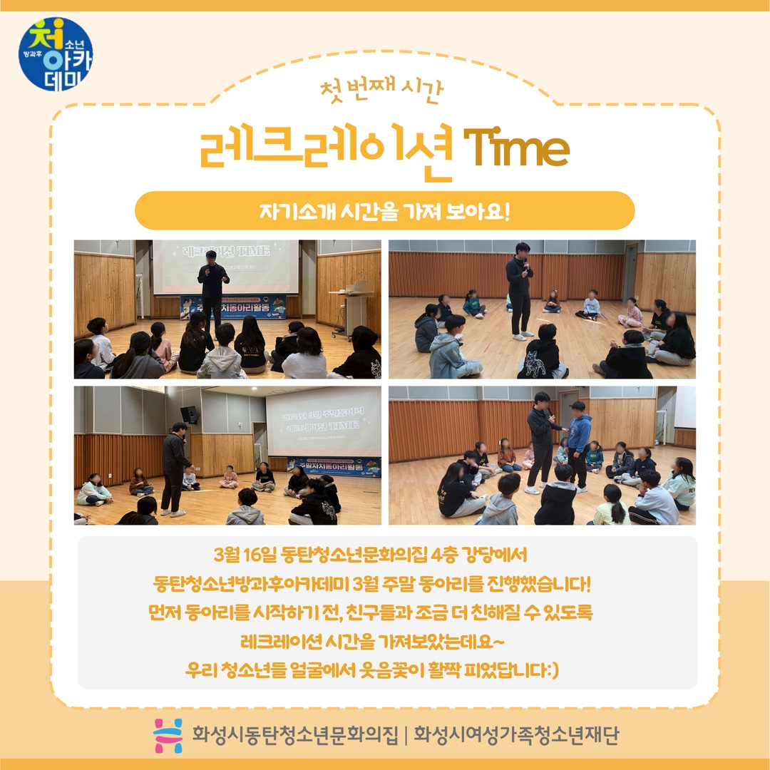 동탄청소년문화의집 청소년방과후아카데미입니다! 3월 16일 토요일에 3월 주말 동아리를 진행했습니다~ 이번 주말 동아리는 청소년들끼리 좀 더 친목을 다져보고 어색한 분위기를 날려버리기 위해 간단한 레크레이션과 D.I.Y 동아리 활동을 했습니다.