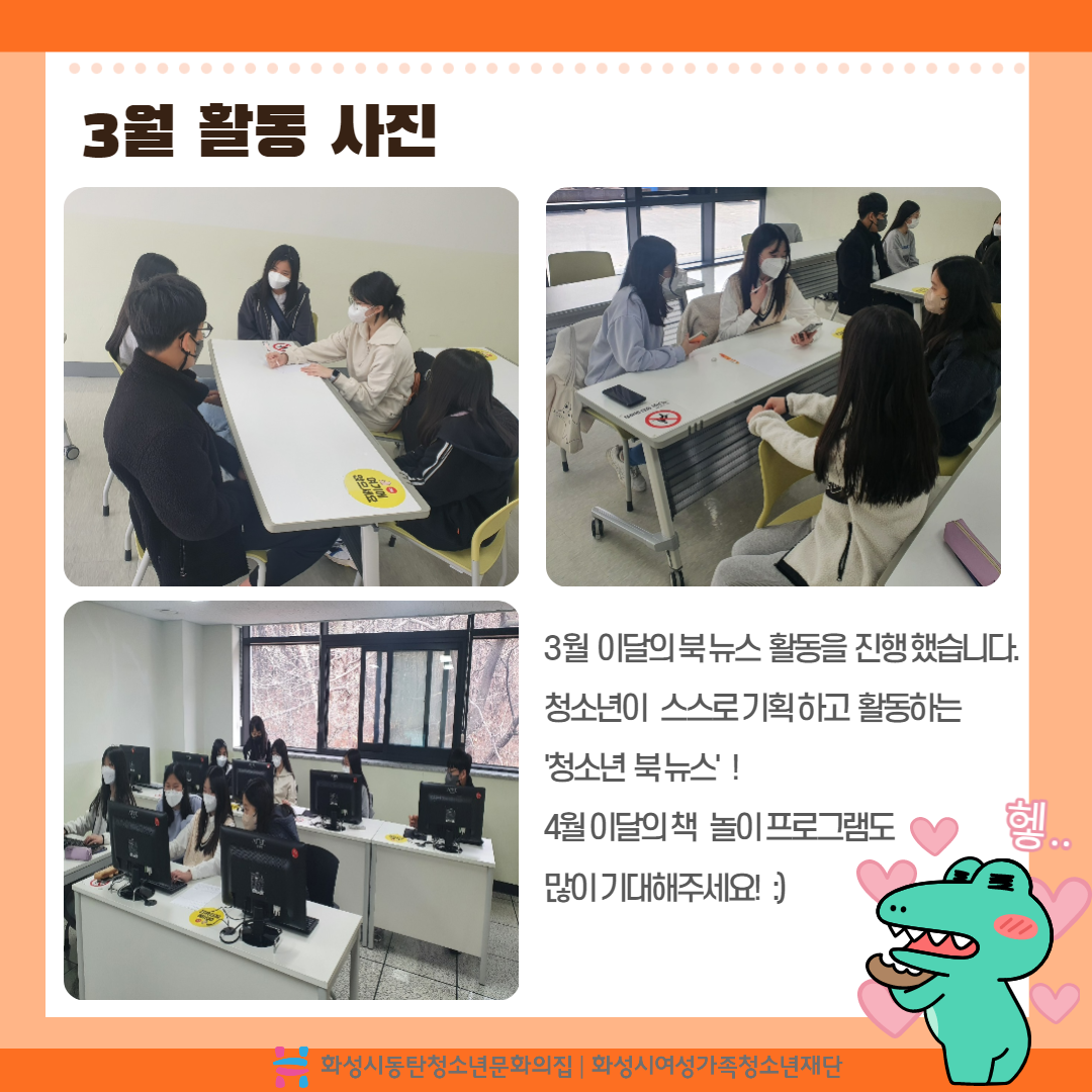 -활동일자 : 2022년 3월 12일 (토) - 활동장소 : 동탄청소년문화의집 컴퓨터실 & 강의실 1 - 활동내용 : 청소년 북 뉴스 OT, 이달의 북뉴스 제작 |